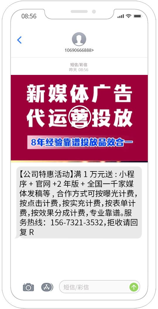 視頻短信發(fā)送能夠覆蓋移動、聯(lián)通、電信用戶,正規(guī)集團(tuán)視頻短信通道,快速、可靠、穩(wěn)定、形象好,能快速將您的訊息投放到用戶的手機。